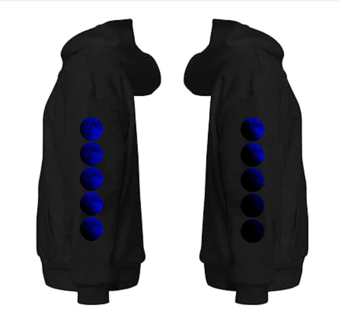 Black hoodie with TURNING BLEU face on front ONCE IN A BLEU MOON and TURNING BLEU logo on back and phases of the moon on the sleeves